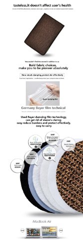 This is a limited edition sleeve case design for MacBook Air. It combines two of the world famous technologies, Technology Bayer and BMT, which make the case extremely thin and light and at the same time provide optimal protection. By using the BMT technology, which manufactures the world's thinnest fiber, the pictures are much more vivid and real. You won't find any product on the market like it. Because it use environmentally friendly material,there is no noxious substance release to environment and No smell of NEOPRENE, SBR.CR, no odor of glue, completely non-toxic and odor-free by European ROSH standards. In addition, all of the air sleeves use the Patented Triangle Design, which makes the sleeve fit the air like a glove. This is the only case on the market that combines a light, thin, fashionable design with great protection. Be prepared to become the center of attention with this fabulous, trendy MacBook Sleeve.